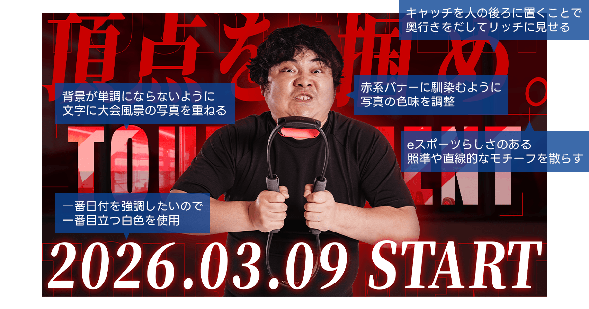 これらの特徴をデザインに取り入れることで、eスポーツらしい力強さやスピード感を感じられるバナーに仕上げました。